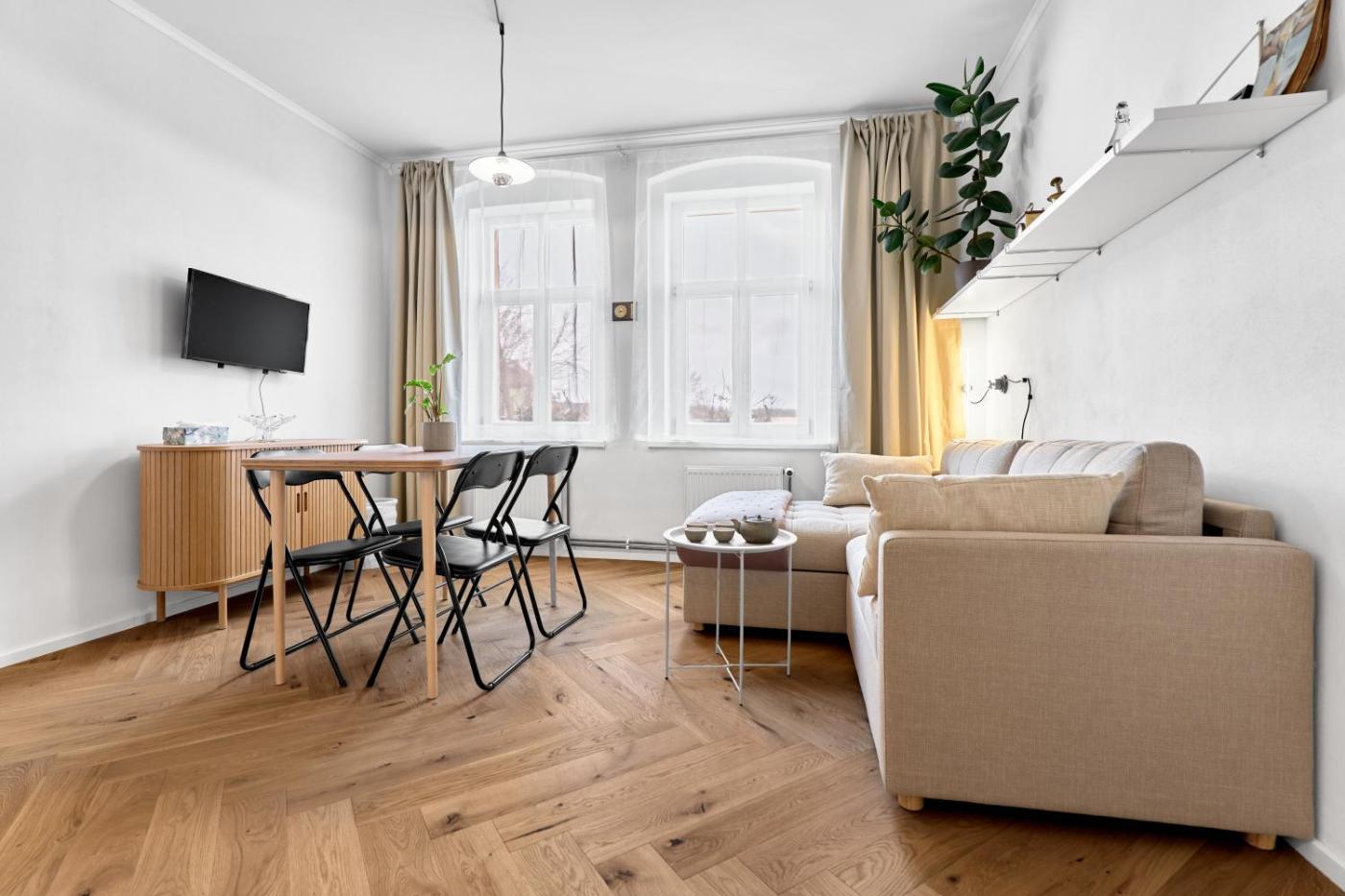 One-Bedroom Apartment. This apartment comprises 1 living room, 1 separate bedroom and 1 bathroom with a shower and a hairdryer. Guests can make meals in the kitchenette that comes with a stovetop, a refrigerator, a dishwasher and kitchenware. The apartment features parquet floors, a seating area with a flat-screen TV, a tea and coffee maker and heating. The unit offers 2 beds.